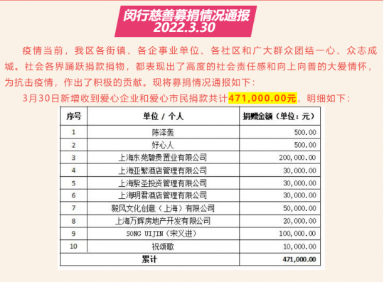 那么LPL的选手又在忙些什么呢?答案是献爱心。昨日上海闵行区通报2022年3月30日慈善募捐情况,其中LPL选手宋义进(游戏ID:Rookie)定向捐款10万元;战队经理祝颂歌(苏小落)捐款1万元。