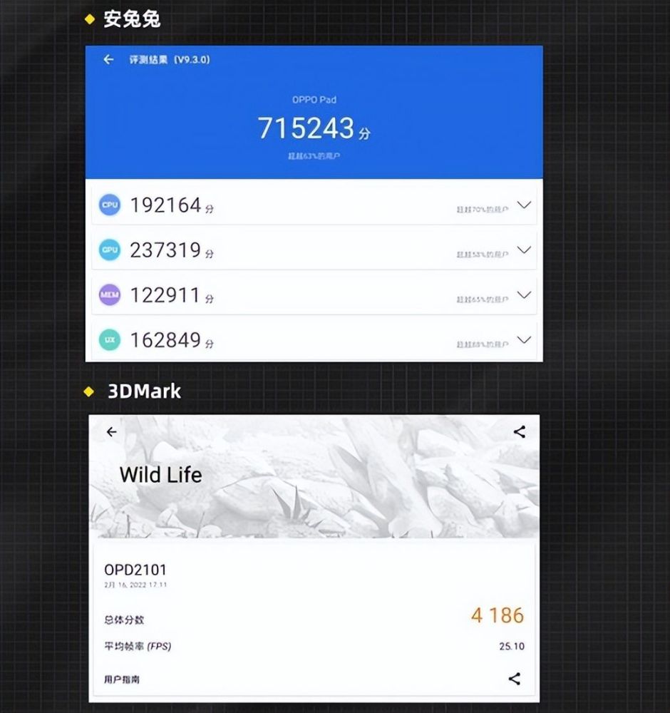 性能方面,OPPO Pad这款手机采用的是“骁龙870+LPDDR4X+UFS3.1”性能组合,安兔兔跑分成绩为715243分,3DMark跑分成绩为4186分,完全是能够满足广大消费者在各种场景使用平板的需求的。