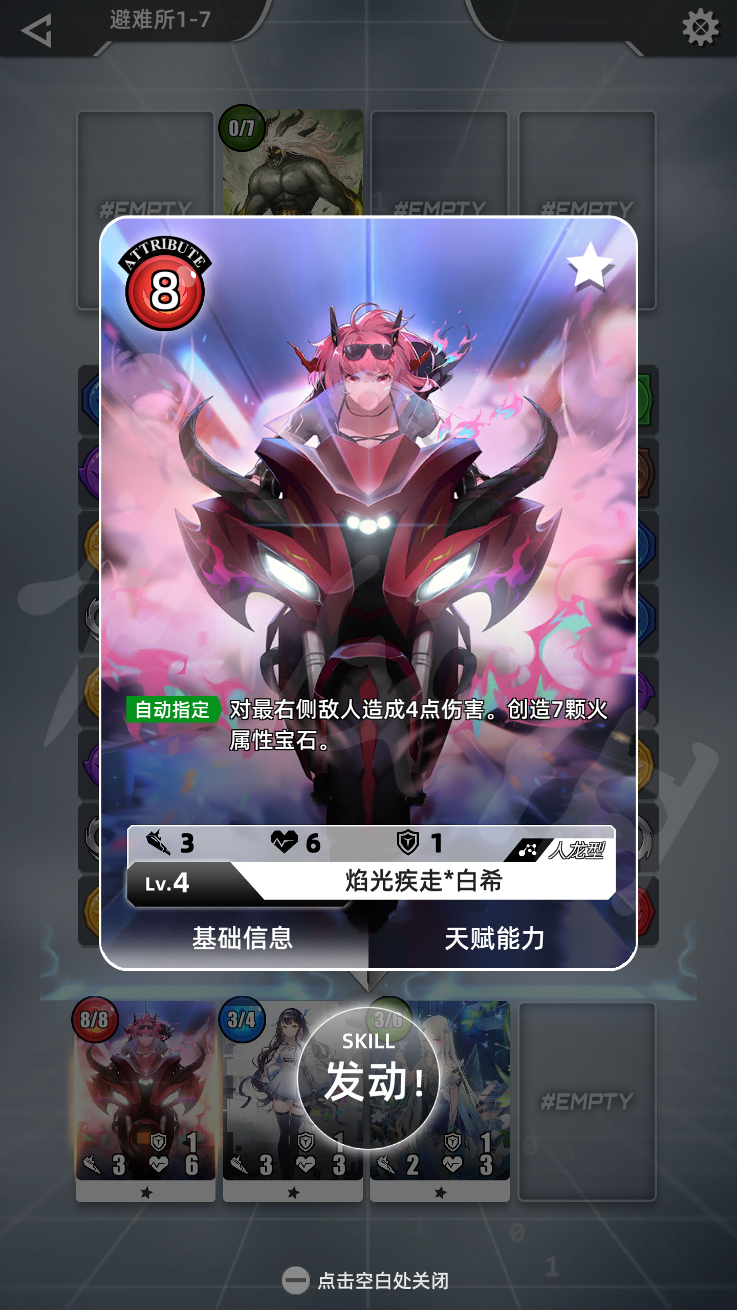 在《百分之一》当中,每张角色卡都将拥有一个可主动释放的技能,释放条件为消除一定个数的属性棋子为该角色攒够足够的技能点,例如角色为光,暗双属性,技能所需的技能点为10,那我们就要消除10个光或暗属性的棋子,且释放技能后,会强制结束玩家当前的回合。我们可以看到,很多角色的技能都是改变棋盘上的棋子分布,使之变得更加易于利用,但是,我的回合都被强制结束了,这岂不是为敌人做嫁衣?有好几次,我使用了增加场上直伤棋子数量的技能,然后,很快啊,AI敌人啪的一下就是个5连消除,我的角色直接被送出场外,请问一下,释放改良棋盘的技能会强制结束回合的机制,是为了完成龟野先生的任务吗?