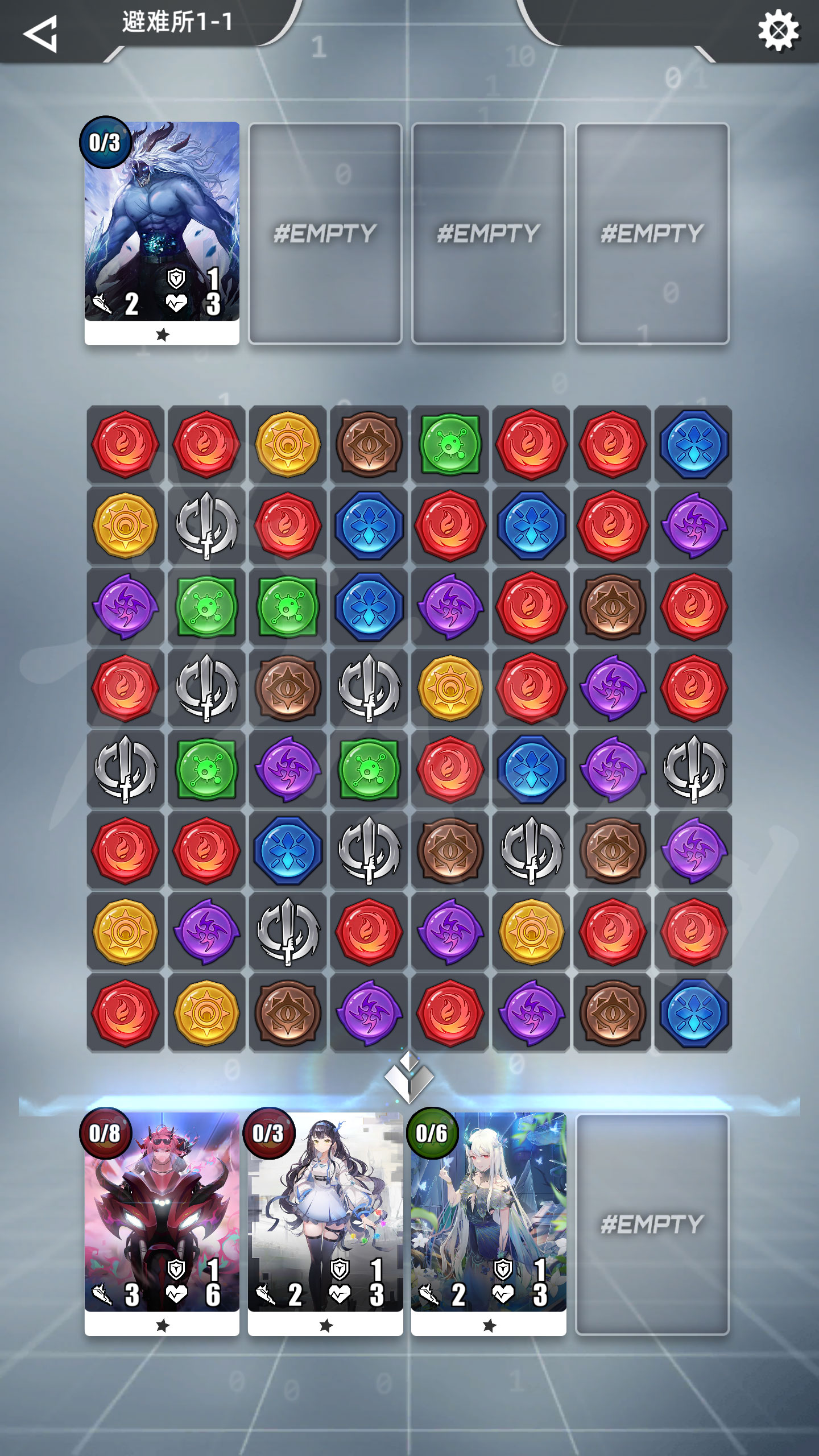 《百分之一》的三消玩法界面分三个部分,棋盘,我方阵营和敌方阵营,玩家选择出战的卡牌和敌人都有固定的三个属性:血量,护甲和攻击力,血量归零便会下场,率先将另一方全部上场卡牌打下场的一方获得胜利。棋盘上共有两大类棋子:直接攻击型和积攒技能型,顾名思义,消除掉直接攻击型棋子,我方卡牌便可直接发起一次等同于攻击力的攻击,而消除积攒技能型棋子,则会为我方对应属性的卡牌积攒对应个数的技能点,当技能点足够发动技能时便可发动角色技能。