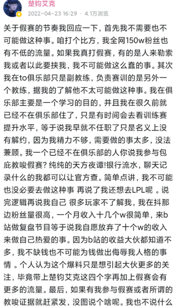很快,楚钧就回应了这位知情人的说法。他表示自己不算教练,只是挂名副教练。甚至不住在战队基地。名义上没有解约,实际上跟战队没关系了。楚钧表示自己粉丝很多,一个月轻轻松松赚十几万。为了热爱的英雄联盟他放弃这些钱,说明教练不缺钱,无需通过打J赛这种方式赚钱。这位知情人可能只是想加上楚钧艾克的名字,吸引大家注意。