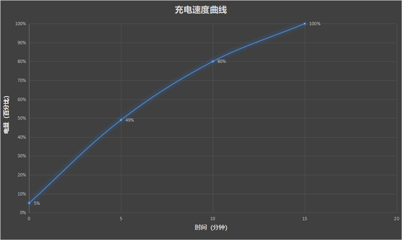 我们先开启“极速充电”模式,从5%电量开始充电,实测可在5分钟就可充至49%,4500毫安电池完全充至满血共用时15分钟。