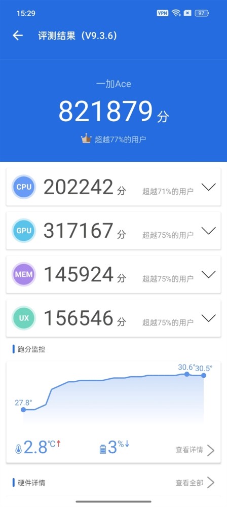 硬件层面,天玑8100-MAX+游戏独显芯片+高达35198.2平方毫米的超晶石墨散热,软件层面配合HyperBoost游戏稳帧引擎,让一加的Ace性能最大化发挥出来。