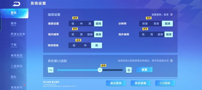 在《QQ飞车》中,我们将游戏的画质设置改为超高,分辨率改为超清,局内帧率、局外帧率改成极高,特效等级为高。