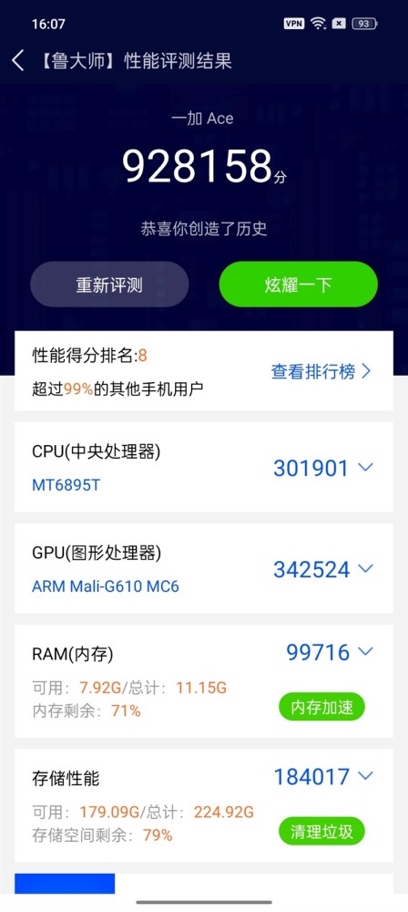 其中CPU得分为301901分,GPU得分为342524分,内存得分为99716分,存储得分为184017分。
