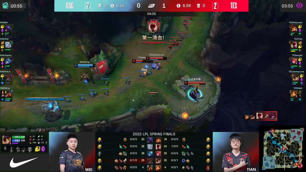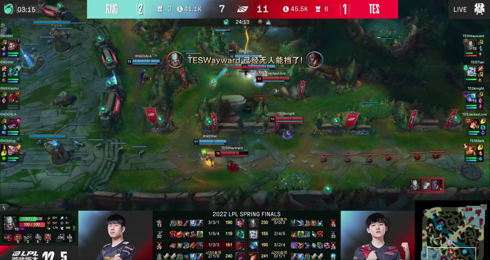 在双方比分来到2比2的时候,我们LPL决赛也是响起了战歌,双方都在最后一局中出现了变招,首先是中下拿到了佐伊+炸弹人,其次是bin在明知有counter位的情况下掏出了武器大师,这一手BP也破坏了wayward想选三板斧的节奏,最终拿下纳尔,在前期wei破败王不断地抓上,武器大师装备成型非常快,一直牵制着TES注意力。这也导致wei在面对TES如此强势的前期阵容中硬是偷了两条小龙,最终装备成型的贾科斯无人能挡,RNG成功赢下比赛拿到了2022LPL春季赛的冠军,同时也是队史第五冠。