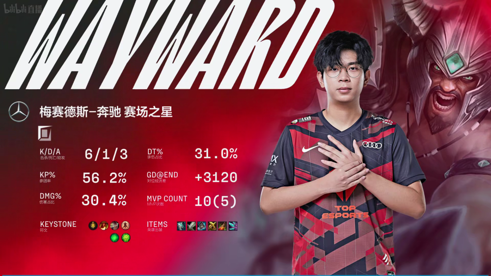 在第四局的比赛中,TES三条线都打出了对线优势,下路女枪这名英雄很好的限制了假的对线节奏,上路wayward掏出了三板斧之一的蛮王,全场比赛中多次依靠蛮王的大招机制强行越塔打开局面,最终成功地拿到了第二分。