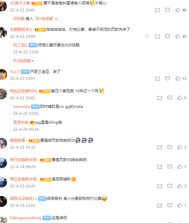 有趣的是bin被处理还上了热搜,小明这位冠军辅助是否会被罚?春季赛已经结束,裁判报告短时间内不会公布。看到小明赤脚、伸懒腰的细节,观众都在打趣:谁发了这个视频,被联盟注意到的话,到时候就要给小明转钱。