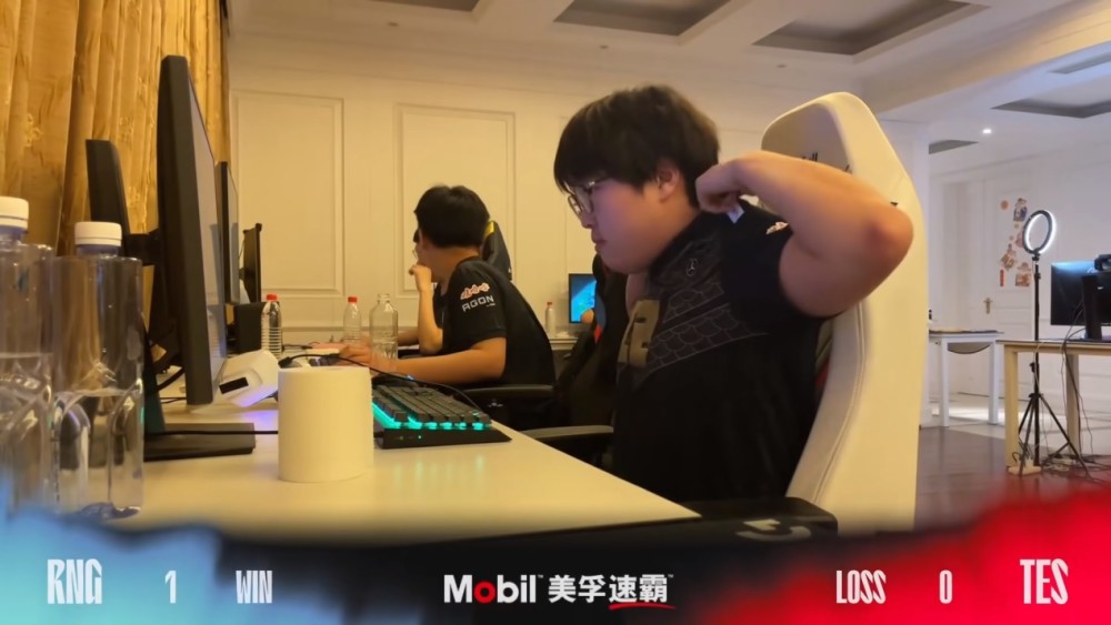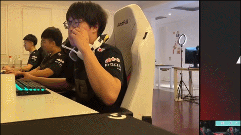 在第一局打TES赢下来之后,总决赛是第一时间把镜头切给了RNG的基地,结果Bin选手第一时间把耳机摘掉之后,直接作势要脱衣服,然后看了队友一眼觉得不对劲,本来准备脱衣服的手直接停止动作,放在脑袋上摸了摸头。
