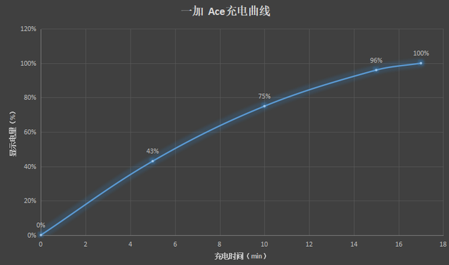 将一加 Ace电量放空,从0%开始充电到完全充满仅耗时17分钟,5分钟就能充满43%的电量,充电速度非常之快。它还支持PPS、PD、QC等多种行业快速充电协议,只要手上的充电头支持上述协议就可以为一加 Ace快充。