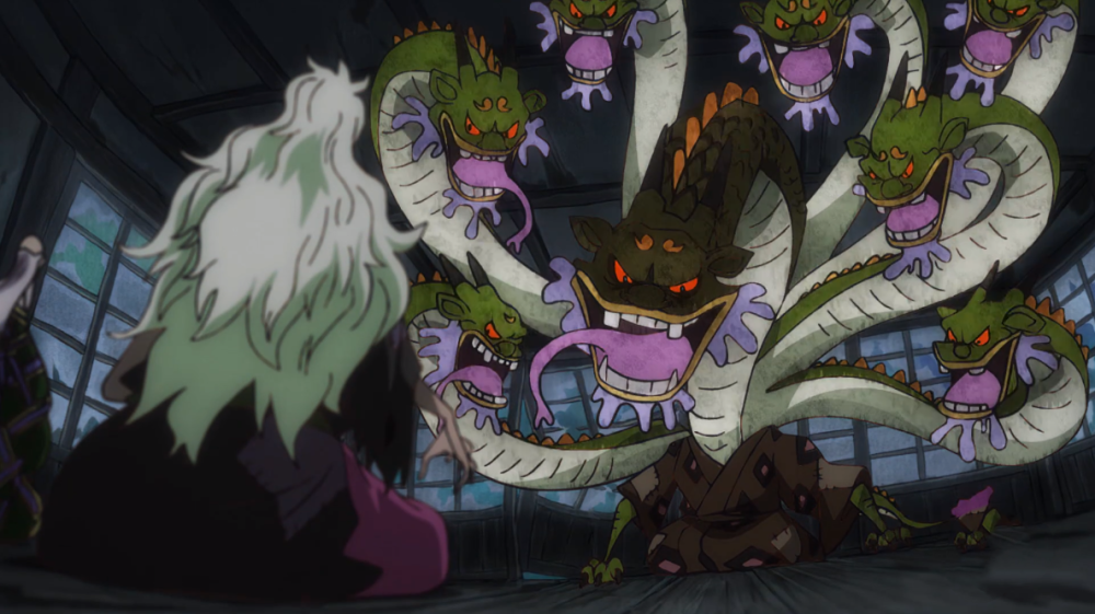 老实说,我个人觉得黑炭大蛇是整个和之国篇中被塑造得最失败的角色,原本以为他会是媲美凯多的大佬,结果每次登场就是被人打被人砍,毫无逼格。而且,幻兽种八岐大蛇这种传说中的果实在他身上也是暴殄天物,全程只有头多这个优点,完全不符合幻兽种的定位。