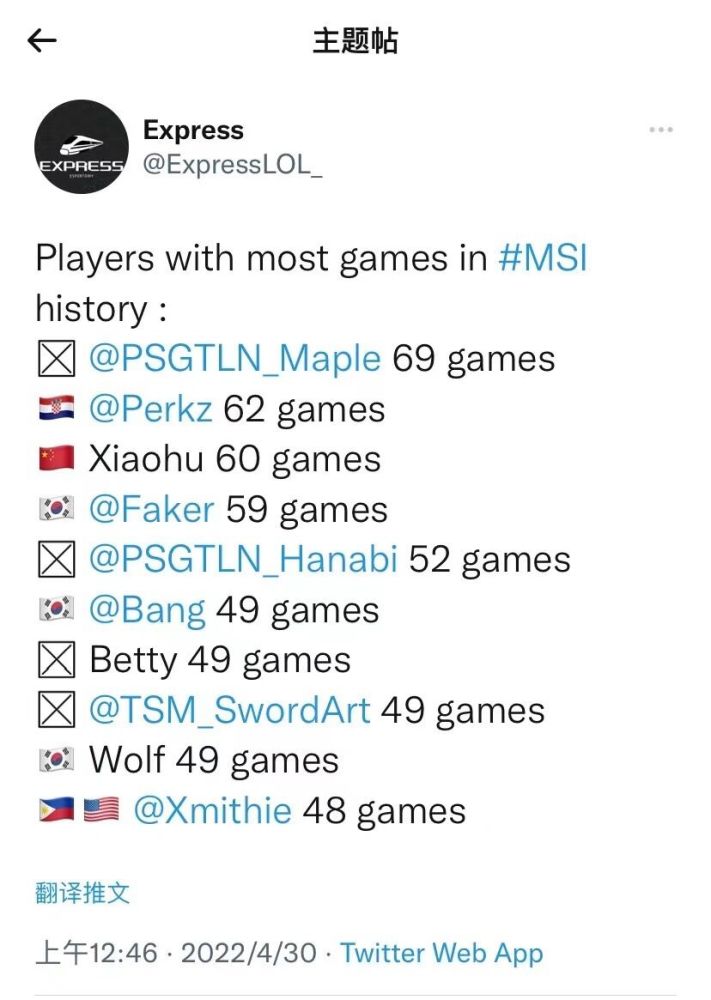 首先就是选手在单届MSI上取得的成绩,成绩越好场次越多,当然BO5打满的越多场次也会越多。然后就是选手参加MSI的次数,如果一个选手多次参加MSI,就可以弥补单届MSI场次不多的缺失。