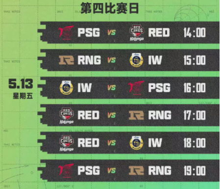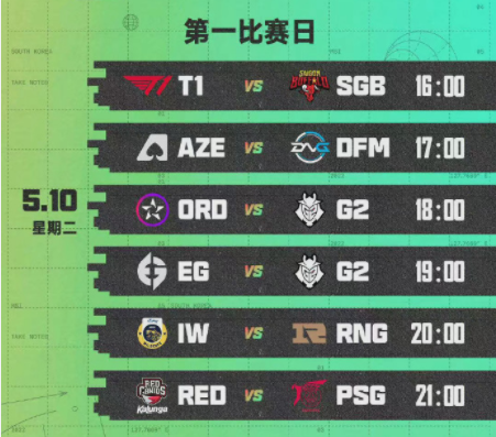 从这个赛程来看,揭幕战就是T1和SGB的比赛,时间也安排在下午4点,这个时间点倒是安排得非常合理,这也让绝大多数人都可以看到比赛,并且也不会熬夜。在5月10号也会有RNG的比赛,RNG的首场对手已经确定了,那就是IW,比赛时间则是在晚上8点,这个时间点倒可以说是黄金档。