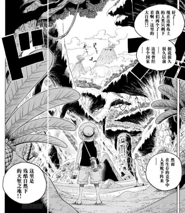 这是一座纯天然的岛屿,动物之间的生存竞争,毫无人性地捕杀与掠夺就是为了一个目的——生存。路飞面对的就是这些动物,在动物眼中不是杀就是被杀,所以路飞只有不断地打败它们,将它们打服打败,唯有这样才能生存下去。