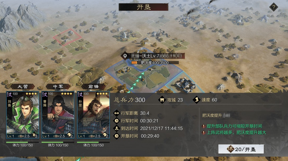 在全新的沃土玩法当中,玩家在攻占沃土之后,可以通过开垦土地来提升土地肥沃度,肥沃度达到上限时土地便会立即变为丰收状态,对资源获取、税收、屯田收益皆有大幅加成。
