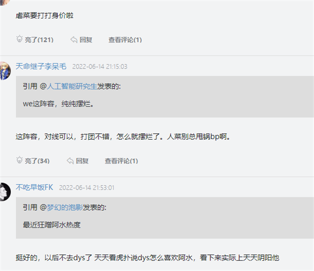WE这场比赛表现拉胯,乌兹更是唏嘘:现在谁站出来帮WE也没用了,杰克爱送两波也不行,而且他这次打得很稳。不得不说,乌兹真的很敢开团。阿水“送”的问题时常被诟病,这么多解说只有乌兹敢这么直白地说。