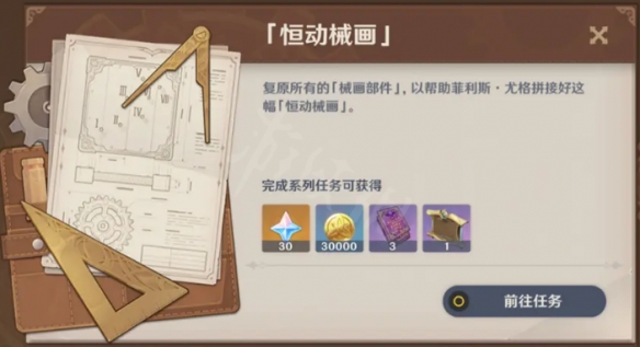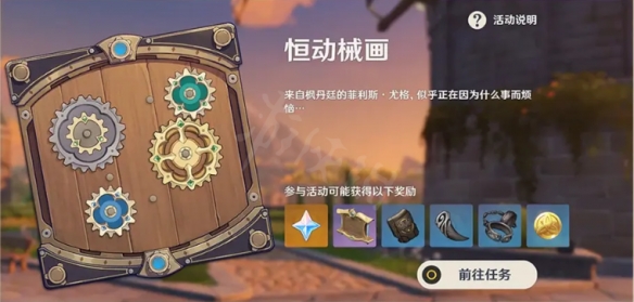 活动期间,帮助来自枫丹廷的菲利斯·尤格解决烦恼,复原「械画部件」并拼接「恒动械画」,完成后即可获取原石、摆设、大英雄的经验、武器突破素材、摩拉等奖励。