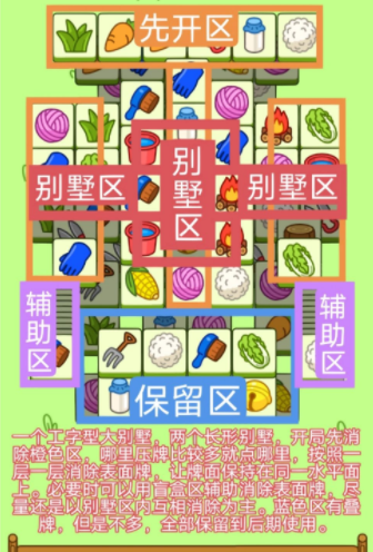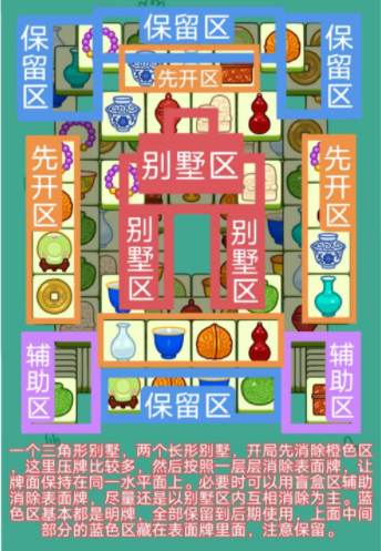 开局先消除橙色区的牌,这里压牌。尽量要让牌面保持在同一水平面,然后一层一层消除表面牌,不要跨层太多拿牌,等表面牌消除完后,以大别墅内互相消除为主。