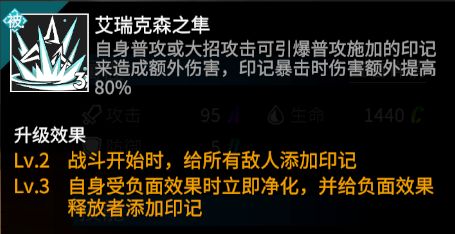 薇薇安释放大招后,首先会对我方全体手办施加一次净化,如果友军身上有多个负面效果,则只会随机净化其中一个负面。之后,薇薇安会随机攻击敌人4次;如前所述,被动或普攻施加的印记,主要依赖大招的随机攻击来触发。大招升级后,每次随机攻击命中不同敌人时伤害会额外提高,该效果可极大提高薇薇安面对群体敌人的输出能力;大招提升到满级后,随机攻击次数加1,在提高整体伤害的同时还额外增加了触发印记的几率。