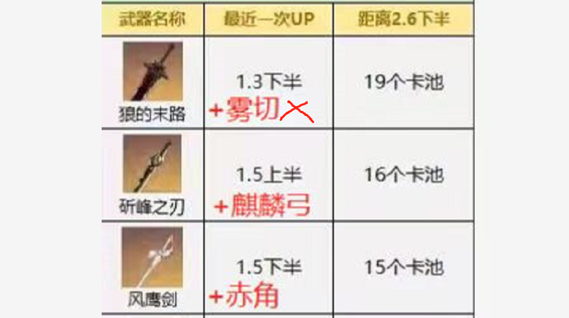 因为按照以往卡池的规律,策划为了保证一些角色的流水不至于太难看,会在强度较低的专武中搭配很不错的武器,比如月华+薙刀、神乐+绿剑。在目前等CD的武器中,狼末是最好最通用的,策划需要它来带动某个低人气角色的专武,所以不能先配雾切。