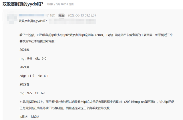 IWD在直播中表示,就是因为LPL季后赛非常艰辛残酷,反观LCK在这些压力超大并决定整个系列赛的第五场决胜局得不到他们需要的练习。随后他还给出了一些佐证自己观点的数据,举例了近三个赛季LPL与LCK冠军在季后赛经历的对局数量,结论是LPL一号种子的比赛对局数接近LCK的两倍以上。