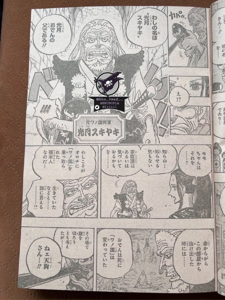罗宾独自待在将军府的地下室里。这时,天狗出现并取下了面具,原来他就是御田的父亲、前任将军寿喜烧。他并没有死,而是被囚禁了起来,直到御田死后才逃出。面对已经完全落入凯多手里的和之国,他心灰意冷,于是隐藏身份躲在民间。
