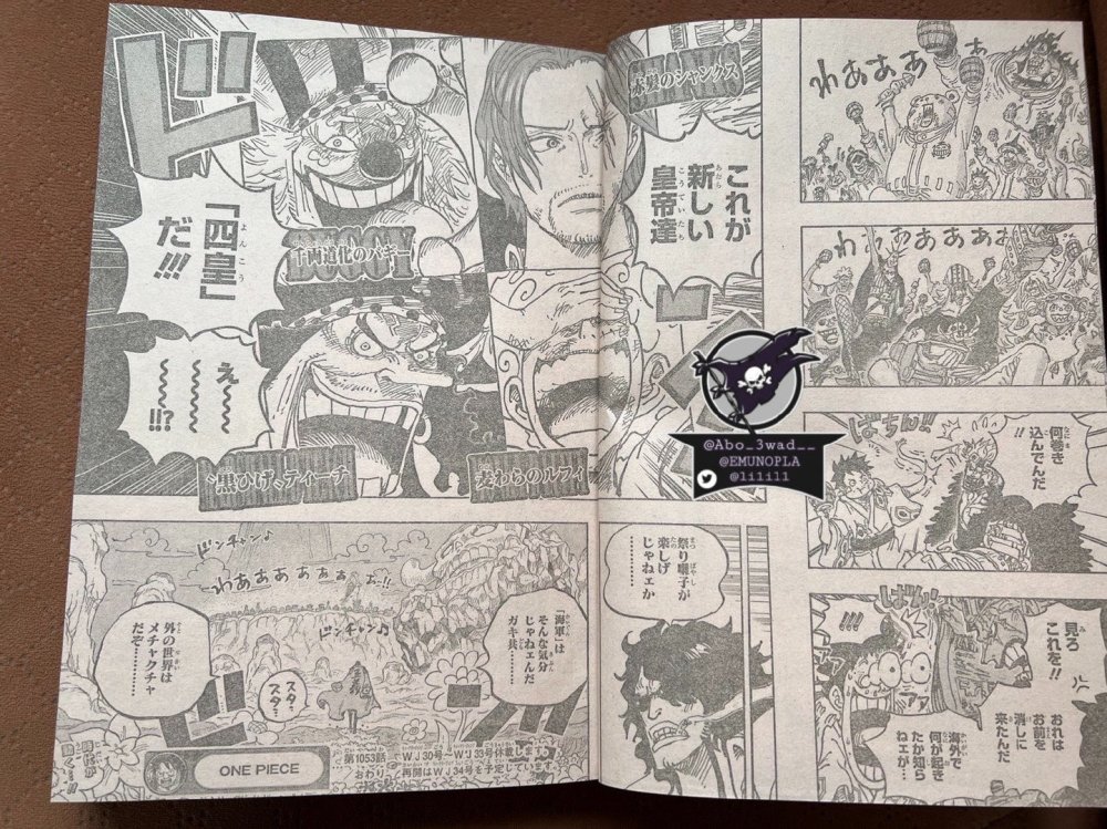 《海贼王》1053话的完整版情报图已经出现了,这一话主要描述和之国的庆祝宴会,公布三个船长的新赏金、新四皇名单,以及绿牛的登场。按这个进度,和之国篇至少还有一话才能完结,下一话应该有绿牛的战斗场景。