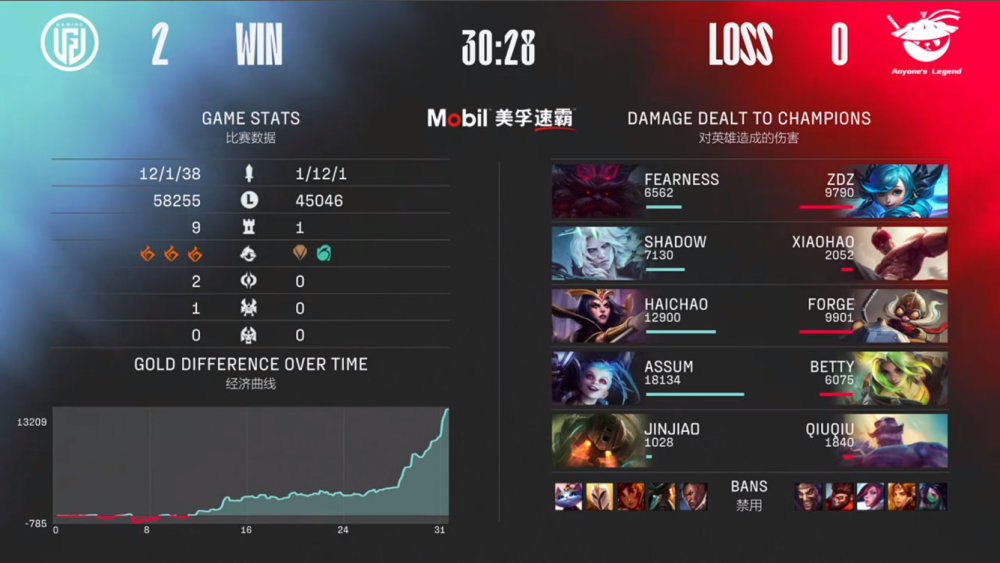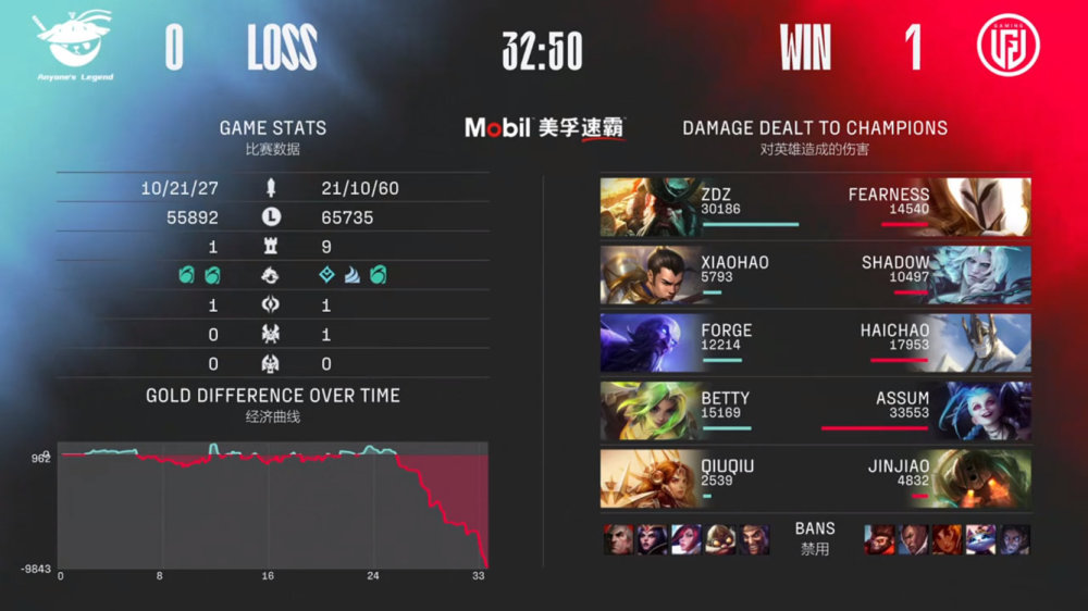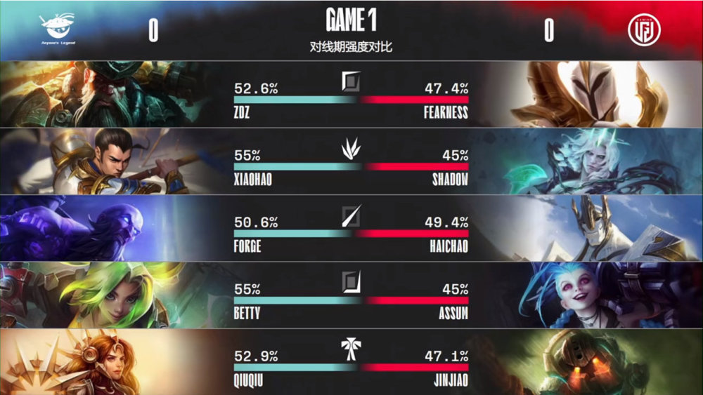 第一局比赛,AL蓝色方,禁用德莱文、飞机、剑姬、乐芙兰、乌鸦,选用Zdz船长、Xiaohao赵信、Forge瑞兹、Betty泽丽、QiuQiu蕾欧娜;LGD红色方,禁用猴子、卢锡安、岩雀、悠米、塞拉斯,选用fearness天使、shad0w佛耶戈、haichao加里奥、Assum金克丝、Jinjiao泰坦。