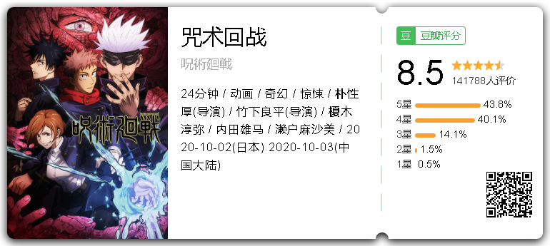 这部动漫至今在豆瓣评分8.5,而评分人数也是超过了14万人,从评分人数就看得出有多火了,同期的《鬼灭之刃》评分人数20万多一点,对照就能感觉得出。