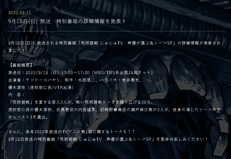在这个月份举行特别活动或许一方面是为了促进《咒术回战0》的BD销量,另一方面我觉得或许是第二季在明年一月或者四月开播?我感觉这样的可能性比较大,总之,一起期待,特别活动的更多公开信息吧!