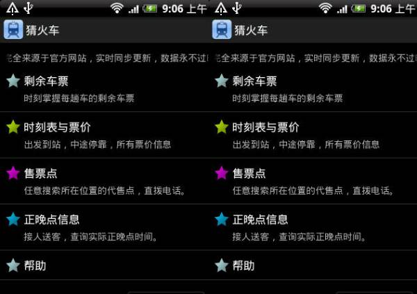 猜火车安卓去广告版是专门为android智能手机开发的火车信息查询专用软件,此软提供火车信息查询服务,支持所有Android机型。包括火车余票,售票点,时刻表,停靠车站,票价,正晚点查询等各种火车信息查询等各种功能。支持所有网络类型,包含WIFI/3G/GPRS/CMWAP/CMNET/. 数据永远都是最新数据,与铁道部官网实时同步,永不过时,且网络流量少。