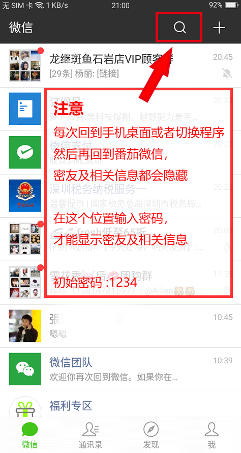 注意事项:切换显示/隐藏模式方法:如未设置密码,内摇一摇手机:切换;设置密码后,只能在首页聊天列表页面最上方搜索框:(如看不到,往下拉一下即可)输入密码进入显示模式,请一定记住您的密码,如忘记密码,只能卸载应用后重新安装。