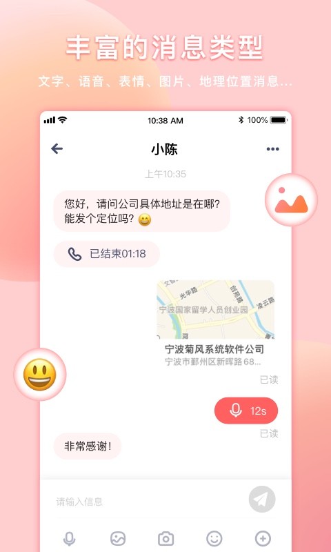 3.丰富的消息类型,文本,语音,表情符号,图片,地理位置消息。