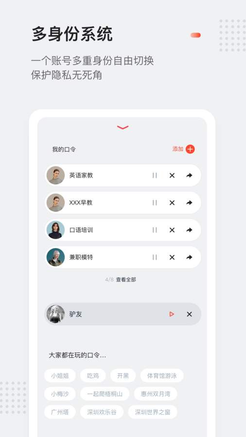 1.口令电话app多身份系统,一个帐户和多个身份可以自由切换,保护隐私而不会出现盲点。