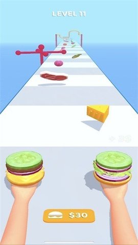 2、从左向右滑动,滑动肉饼,避开障碍物,让最大的汉堡成为可能。