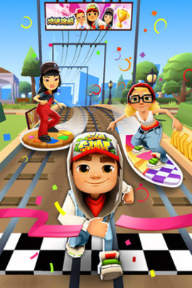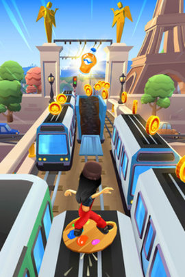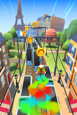 地铁跑酷用磁铁吸金币。在30倍的速度下,一枚金币在结算时是60米,金币越多,最终得分越高。