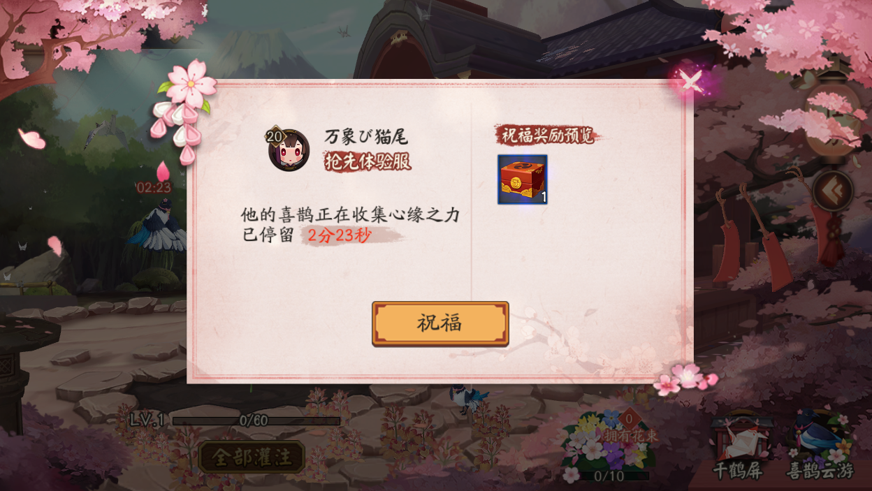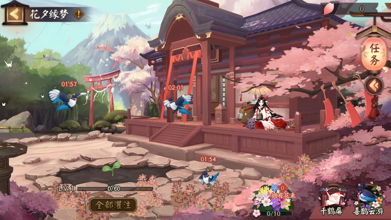 活动由「缘结花束」「任务」「千鹤屏」「喜鹊云游」四部分组成,阴阳师们通过参与不同的玩法即可获得对应的丰富奖励。