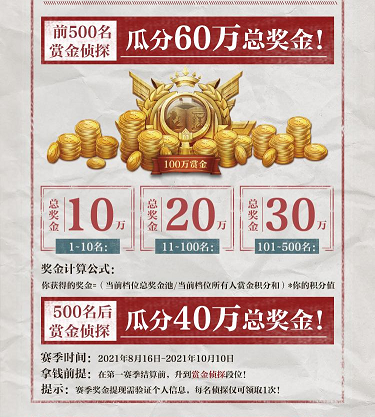 《赏金侦探》APP百万赏金第一赛季将于8月16日上午正式开启!这是一次将脑力与竞技强强联合的比赛!赛季积分榜排名前500名的侦探可参与瓜分60万现金,余下所有上榜者则平分40万现金!