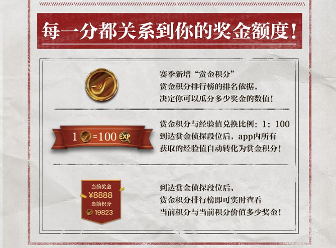 除了前期通过激活百万赏金大作战获得的积分外,在《赏金侦探》APP中,你首先需要先成功将段位提升至【赏金侦探】后,才能进入赏金赛季的竞赛圈。提升段位没有想象中难,只需完成每日任务、每日小案以及处理案发现场接收的案件获取对应的经验值,就可以进阶升段,达到【赏金侦探】段位后,所获得的经验值都将会以100:1的比例换算成“赏金积分”,助你冲刺赏金榜单!