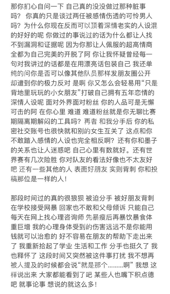 这个前女友就是一开始锤小虎的,锤的三点是说小虎玩弄感情,背刺队友,还有分手后无缝找了下一个女生(就是大家说的那个分手后给五万的女生)。
