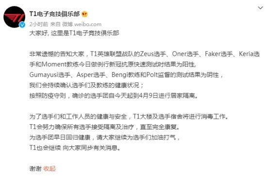 昨天下午,T1电子竞技俱乐部在社交平台上发布了公告表示队内四名首发选手感染了新冠,以下是T1电子竞技俱乐部微博原文:“大家好, 这里是T1电子竞技俱乐部非常遗憾的告知大家,T1英雄联盟战队的Zeus选手、Oner选手、Faker选手、Keria选手和Moment教练今日做例行新冠抗原快速测试时结果为阳性,Gumayusi选手、Asper选手、Bengi教练和Polt监督的测试结果为阴性,我们会持续确认选手们及教练的健康状况;按照防疫守则,确诊的选手团自今天起到4月9日进行居家隔离。为了选手们和工作人员的健康与安全,T1大楼及选手宿舍将进行消毒工作。T1会努力确保所有选手接受隔离及治疗,直至完全康复。为选手团早日回归健康,请大家继续为选手们加油打气,T1也会继续 向大家同步有关消息。”