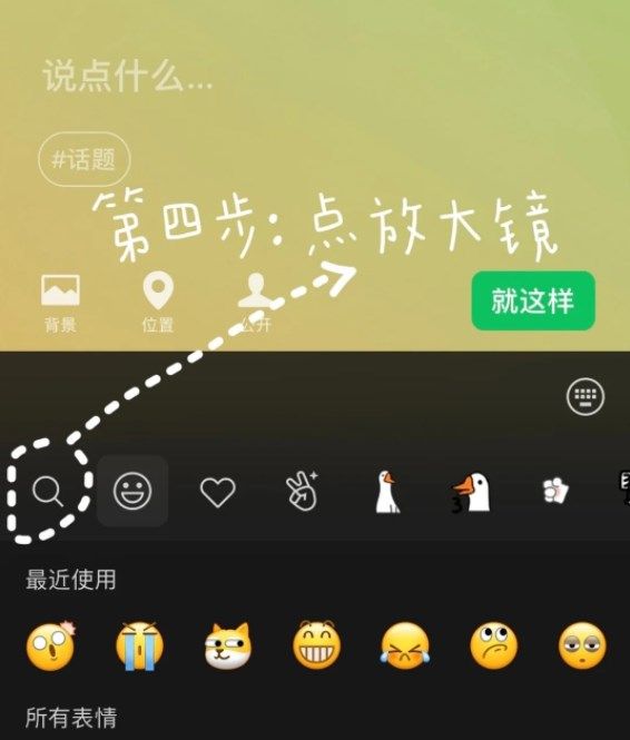 3、编辑状态的时候选择输入表情,但是不直接使用emoji表情,而是点放大镜图标进入搜索。