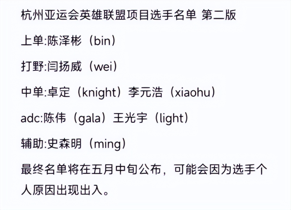 在说亚运会名单之前先说一下LCK的初选名单,他们那边看似是十个选手,但GEN团长在话里话外中表示另外四个就是陪跑选手,实际上就是T1全队加Canyon,这也和大家之前的预测一样,LCK之所以选用T1全队除了他们实力很强并且不用磨合之外还有一个原因,就是他们吸取了上次亚运会失败的教训,LCK认为上一次输就是因为LPL以RNG选手为核心,所以这次他们也准备效仿,对于这次LPL选人有两个消息,大家可以分析一下是否合理。