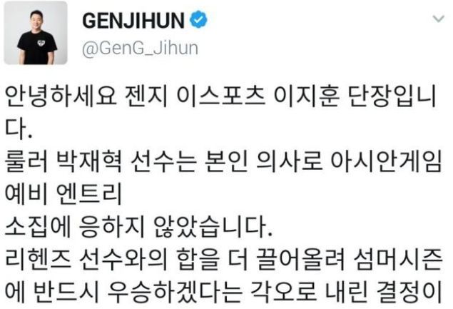 就在昨天GEN的管理层给出了ruler不参加的原因,ruler之所以拒绝了亚运会的征召是因为想和辅助继续磨合好好备战夏季赛。这个解释看上去就相当敷衍,随后这名GEN的管理继续说道:“我对这个征召方式非常不理解,因为热身赛将会有四名选手成为傻瓜。”这段话的意思就是GEN的管理认为ruler即使去了也是陪跑。因为最终的亚运会名单仅仅只会有一个替补,ADC位置上首发肯定是小吕布,ruler能不能成为的替补先不说,就算去了也基本不可能上场,所以完全没有去的必要。