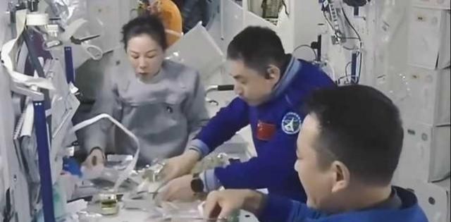 这是第二批空间站出差三人组吃饭的场景,桌上有两根带子,可以把装食物的包装袋压在下面,防止食物漂浮起来。如果要打牌,也可以在出牌时将牌压在带子下面。不过也很费力。有这精力,不如玩点其他游戏。