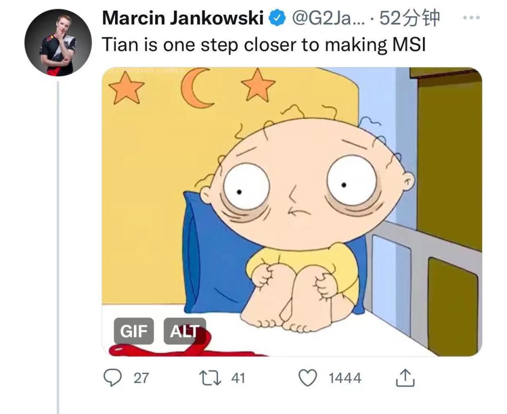 随着TES晋级到决赛,这也是Tian连续三次晋级LPL决赛,去年他连续两个赛季都晋级决赛,但吃了双败赛制的亏,最后都苦吞两个亚军!如今这一次Tian却是吃了双败的福利,从败者组重返决赛,连续三次晋级到这个终极BO5,也是宣告了自己证明了自己:天依旧还是那个天!对此G2在社交媒体上整活,表示看到Tian晋级决赛,就已经开始瑟瑟发抖了,尤其是Jankos,大概是想到那年的盲僧吧!
