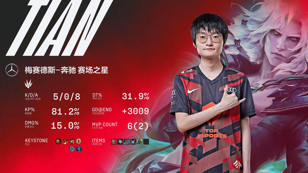 不得不说TES在这场比赛里的表现,总会给人一种想要到败者组体验的感觉,毕竟之前在胜者组输给RNG的比赛,虽然结果是输了,但他们在前期的节奏都非常好,只是后期缺乏一些运营决策被RNG抓到了很多机会,最终导致连续被翻盘输掉了比赛!但在这场BO5里,TES在前期的节奏抓的非常好,尤其是中野的状态是拉满了,滔搏如今这五个人的确是“兄弟联盟”最正确的五个人,新人Wayward的独当一面,水手轮流站出来Carry,还有那个敢于开团的Mark,而真正让队伍转起来的就是打野Tian,尤其是他那一次比一次要好的状态!