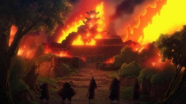 紧接着画面来到了黑炭大蛇和日和这边,之前大蛇在废墟中被小紫打上了海楼石钉子,之后又被火前坊点燃,似乎已经要被烧死了。但没想到这时候黑炭大蛇身上的海楼石钉子掉了,于是大蛇再次发动了八岐大蛇果实的能力,又开始了变身。