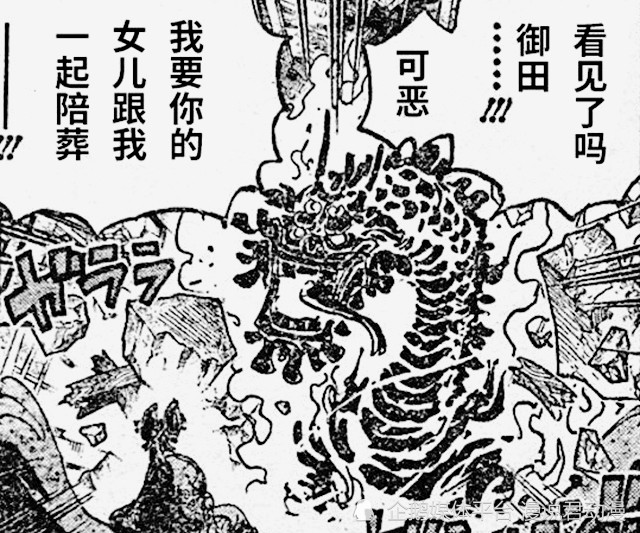 最后说一说黑炭大蛇。和之国命硬的家伙太多了,黑炭大蛇自讨苦吃,招来的火前坊却烧到自己身上。本话情报显示,燃烧的黑炭大蛇身上的海楼石钉子掉落,黑炭大蛇开始变形,幻兽种八岐大蛇的能力又能使用了。