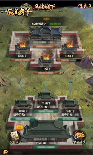 2、对战期间,官人以衙门的战斗方式,派遣门客与敌方联盟驻守城门的所有门客进行作战,全歼驻守门客后扣除城门血量;(注:无人驻守则直接扣除城门血量。)